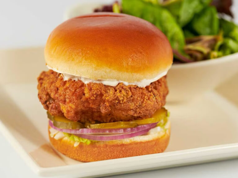 Crujiente Pechuga de Pollo (88 g) con Lechuga, Pepinillos, Cebolla y Aderezo Ranch o Mayonesa Sriracha en un Pan Tostado. Servido con una Ensalada Verde.